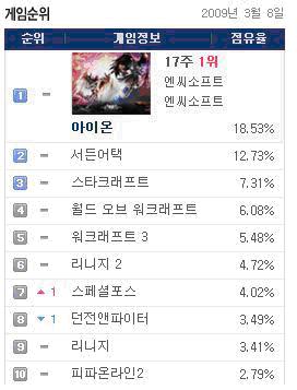 根据gametrics网站3月8日网游排名,AION以18.53%的占有率赢得第一。其实大家看看国外知名游戏门户网站的网游排名就可以知道了,AION真的是大势所趋啊。一款好的网络游戏具备的素质在AION都可以找到:画面、系统、操作。