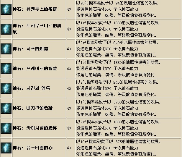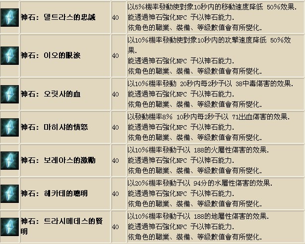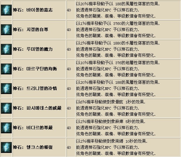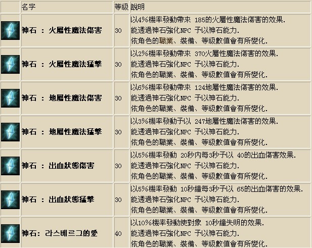 装备等级分类 | 武器详解 | 防具详解 | 饰品详解 | 装备强化的方法 | 强化石说明 | 魔石详细说明 | 神石详细说明 | 装备刻印(绑定)| 装备外形变换的方法 | 可伸缩武器说明 | 可伸缩武器出处整理 | 强化石与魔石种类详细介绍 | 神石强化补遗与种类详细介绍
