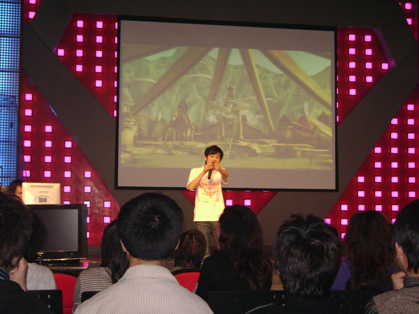 (图片七)主持人邀请RMB网游公会会长发表对AION的讲话。因为活动只准备了3天,告白会长可是三天没睡好呢。但是大家看看他那讲话的姿势和表情。是多么的振奋人心。真的不愧为RMB网游公会的好好会长啊。