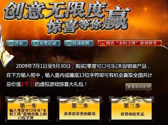 2009年7月1日至2009年9月30日期间,凡购买「零度可口可乐」“永恒之塔”促销包装(印有”永恒之塔”人物形象及活动介绍)的产品均可参加,包装包括500ml/600ml塑料瓶装、355ml\330ml易拉罐装产品的产品,即可参加本次活动。