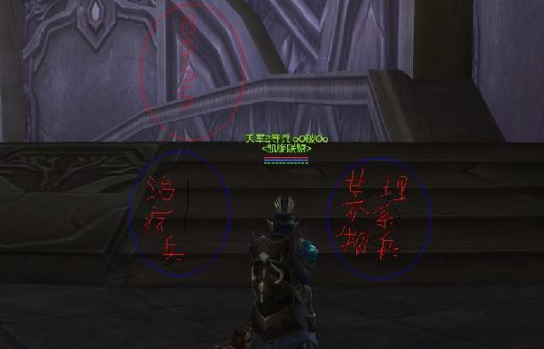 然后从没怪的角落跳下,沿着大石头的边脚绕到BOSS靠墙的一边,这里就是打BOSS的地点。守护可以直接把BOSS拉到这个角落。