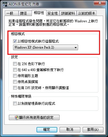 选择『兼容性』的标签页。在『兼容性模式』的部份,检查是否启用『兼容模式』。