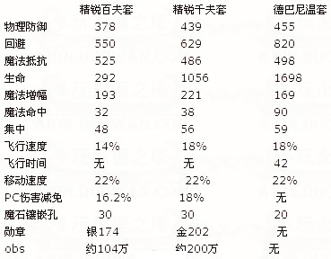 从以上可以看出精锐千夫套的花费大约是精锐百夫套的2.6倍金钱和2倍的时间,换来的大约是生命魔石9孔+加魔法增幅1孔+魔放命中0.5孔-魔放抵抗3孔=7.5孔的魔石优势,飞行速度4%的优势,1.8%PC减伤优势.以及无限的虚荣心优势.个人认为以上优势在实战中无法达到质的变化,所以推荐精锐百夫套。对大多数平民玩家来说何以取舍应该心里自然有数.
