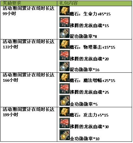 活动内容:活动期间,累计在线时长满规定的时间即可领取龙族大礼一份。