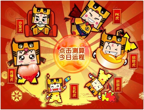其他还有“招财虎”、“拼拼虎”、“沙发虎”、“玄机虎”等运程虎,运用也各有奥妙和玄机,想知道?赶紧去盛大游戏嘉年华网站,一探究竟吧!