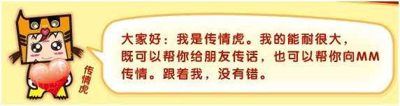 传情虎:这只老虎神通广大,不但会帮你跟跟兄弟传话,也会帮你与心仪的MM传情。大声说出你的心声,让8000万盛大玩家知道你的心里话,让8000万盛大玩家共同帮你圆梦。