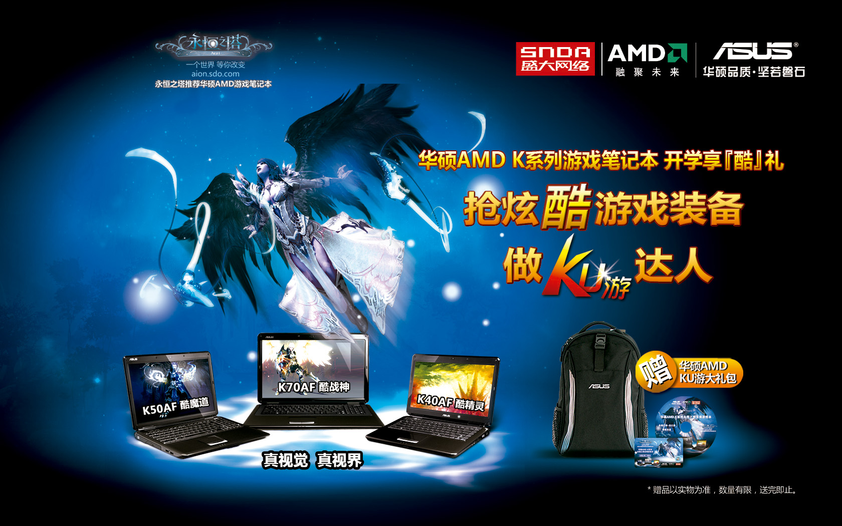 在2010年的开学促销活动中,华硕电脑联合AMD、盛大推出了华硕AMD KU游笔记本。即日起至3月31日,购买华硕三款KU游机型(K50XT52AF-SL /K40ET52AF-SL/K40ET84AB-SL)均可获赠华硕AMD KU游大礼包,包含了白金卡(内含强化石、杰休奇项链、千夫长戒指等装备)、龙之影光盘以及KU游背包在内。数量有限,先到先得,送完即止!详情请登录华硕官方活动网站。