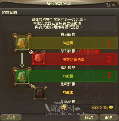 - 合成后的武器将会增加无法贩售 / 无法交易 / 无法储存于帐号仓库 / 无法储存于军团仓库的属性。