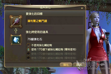 - 将强化补助剂放置于背包中再进行强化动作时,会跳出强化补助剂选择视窗让玩家决定是否要使用。