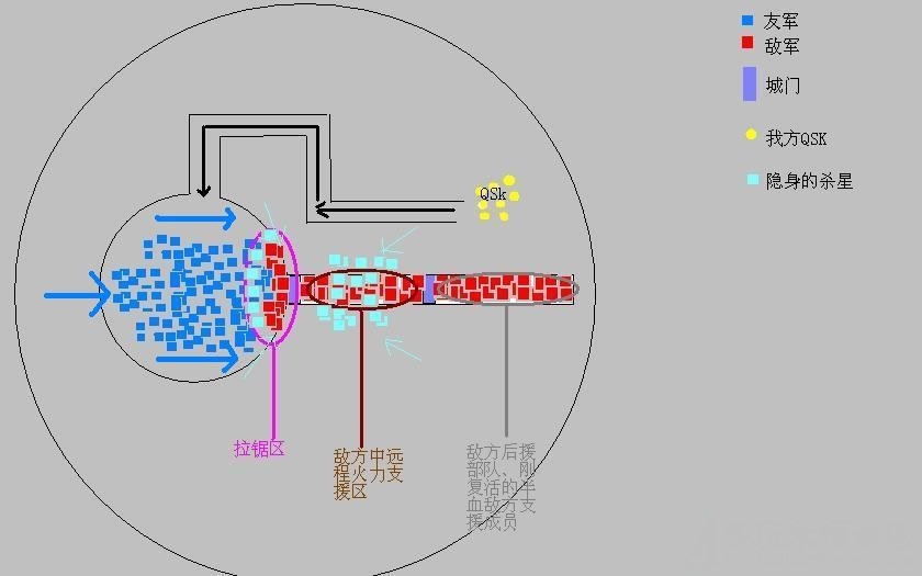 然后就会渐渐形成下图的形势,敌方火力最活跃的两大区域就会不断被吞噬。