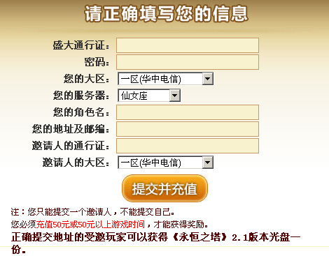 请一定要准确填写邀请人的账号和所在的大区,提交成功并且一次性充值50元或50元以上的游戏时间,即可成功受邀。