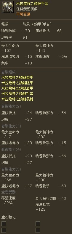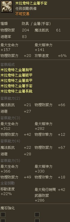 职业介绍 职业特性介绍 | 职业装备需求 | 战士介绍 | 法师介绍 | 侦察者介绍 | 祭祀介绍 | 守护星 | 剑星 | 魔道星 | 精灵星 | 杀星 | 弓星 | 治愈星 | 护法星 技能介绍 战斗技能综述 | 战士技能 | 法师技能 | 侦察者技能 | 祭祀技能 | 守护星技能 | 剑星技能 | 魔道星技能 | 精灵星技能 | 杀星技能 | 弓星技能 | 治愈星技能 | 护法星技能 | 连续技 | (圣痕/烙印)技能 地图速查 天族首都 | 普埃塔 | 贝尔特伦 | 埃尔特内 | 泰奥勃莫斯 | 因特尔蒂卡 魔界首都 | 伊斯夏尔肯 | 阿尔特盖德 | 莫尔海姆 | 布鲁斯特豪宁 | 贝鲁斯兰 深渊(上层) | 深渊(下层) | 深渊(深层) | 深渊传送点示意图 BOSS图鉴与分布、掉落图 魔族BOSS | 天族BOSS | 深渊BOSS 怪物图鉴与分布图 怪物分布、图鉴 | 深渊上层 | 深渊下层) 天族怪物分布 | 普埃塔 | 贝尔特伦 | 埃尔特内 | 泰奥勃莫斯 | 因特尔蒂卡 魔族怪分布 | 伊斯夏尔肯 | 阿尔特盖德 | 莫尔海姆 | 布鲁斯特豪宁 | 贝鲁斯兰 采集点分布图 采集专题(含所有物品采集点) 天族采集点:普埃塔 | 贝尔特伦 魔界采集点:伊斯夏尔肯 | 阿尔特盖德 装备详解 装备等级分类 | 武器详解 | 防具详解 | 饰品详解 | 装备强化的方法 | 强化石说明 | 魔石详细说明 | 神石详细说明 | 装备刻印(绑定)| 装备外形变换的方法 | 可伸缩武器说明 | 可伸缩武器出处整理 | 强化石与魔石种类详细介绍 | 神石强化补遗与种类详细介绍 装备图鉴 2装备图鉴总表 | 隐藏属性套装资料 25级史诗武器 | 值价1200万的翅膀 25级史诗装备-魔族 | 25级史诗装备-天族 橙色武器大全-1 | 橙色武器大全-2 魔族Abyss(深渊)武器(LV30-LV50) 天族Abyss(深渊)武器(LV30-LV50) 天族套裝防具图鉴(LV22~LV50) 魔族套裝防具图鉴(LV22~LV50) 四神套装出处与图鉴(LV47) 奈落套装出处与图鉴(LV47) 任务大全 1-10级天族普通 | 1-10级魔族普通 1-10级天族使命 | 1-10级魔族使命 11-20级天族普通 | 11-20级魔族普通 21-30级天族使命 | 21-30级魔族使命 天族称号任务整理 | 魔族称号任务整理 天族必做任务整理 | 魔族必做任务整理 深渊战场 深渊系统简介 | 天族深渊入场任务攻略 | 魔族深渊入场任务攻略 | 深渊要塞战规则 | 深渊功勋系统介绍 | 深渊点数购买系统介绍 | 深渊要塞战详解 | 深渊古代神器分布及技能效果说明 | 深渊战场武器属性效果图 | 深渊战场25~45级升级攻略 游戏简介 游戏介绍 | 世界观 | 游戏特色 | 配置要求 | 天族故事 | 魔族故事 新手指导 游戏安装 | 登入游戏 | 角色创建 | 游戏界面 | 操作说明 | 连续技介绍 | DP值介绍 | 烙印技能简介 | 互动功能简介 | 村庄功能 种族介绍 天族 | 魔族 | 龙族 | Krall族 | Lycan族 | Shugo族 | NAGA族 | 十二主神 游戏系统 背包系统 | 仓库系统 | 经济系统 | 死亡系统 | 狩猎系统 | 制作/采集系统 | 组队系统 | 任务系统 | 传送系统 | 称号系统 | 变身系统 | 染色系统 | 时空裂缝系统 | 深渊战场 | 公会系统 | 道具系统(等级/强化/镶嵌/外形) | 飞行系统 | 副本介绍 | 宏定义系统 生活技能 生活技能综述 | 布/皮衣制作 | 炼金术 | 料理 | 金属盔甲制作 | 武器制作 | 细工 | 物质变换 | 采集/OD采集 公会详解 盛大出品的公会说明 | 公会简介 | 创建/解散公会 | 公会的成长 | 公会功能介绍 | 公会纹章 | 公会环境设定 | 加入/退出公会 | 公员等级与权限