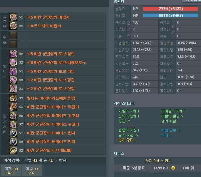 这是韩服2.5军团长全套的魔道的属性图,装备除头饰是发光的华丽的红晶石眼镜,其他都是军团长(在韩服搞到这套装备不容易啊,真心敬佩这位思密达童鞋,你太特么能刷了!),现在给出面板数值的翻译结果: