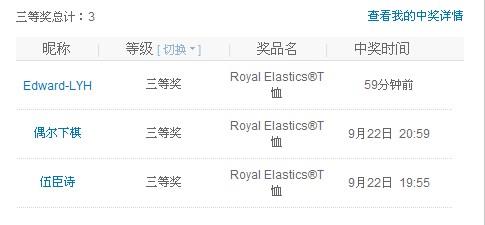 活动仅进行一天,中奖者便不断涌现,让我们看看最新的中奖名单: 9月22日11:00至9月27日中午11:00一等奖1名:【索尼爱立信U5I】一部二等奖3名:【影驰显卡 9600GT中将版】一份 显卡详情:影驰(GALAXY)9600GT中将版 650/1800 512M/256位 DDR3 双槽加强型散热+板载HDMI三等奖20名:【Royal Elastics®T恤】一件四等奖10000名:【新手20小时免费游戏时间】一份
