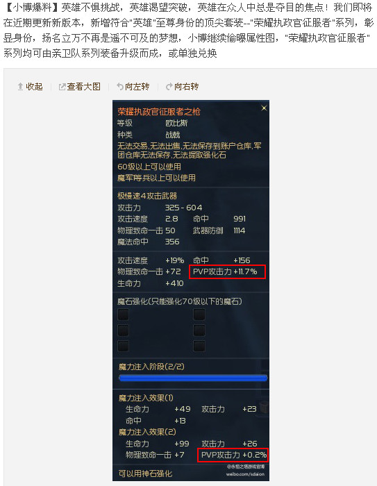 继昨日爆出新军装“荣耀执政官征服者之魔法书”的属性后,今日官方微博再次更新“荣耀执政官征服者之枪”的属性截图。昨日回顾:官博爆料:将新增顶尖套装--“荣耀执政官征服者”系列