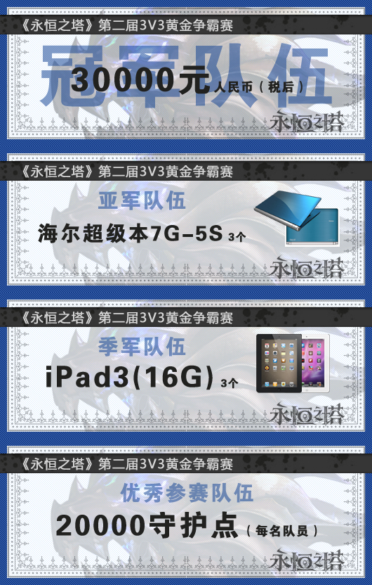 比赛对阵安排,根据现场抽签决定。比赛解说总决赛将由来自CNTV《竞游天下》频道的美女主持“语晴”担纲主持,著名电子竞技主持人“广末”和永恒玩家非常熟悉的小博“随风”联袂解说,他们将为比赛注入更多激情和刺激,更大地提升比赛的观赏性。让我们翘首以待吧。极具亲和力的美女主持语晴冷静幽默的广末 淘汰赛阶段官方御用解说“随风”哥赛事奖励冠军将获得3万元人民币(税后)现金奖励,亚军将获得由海尔提供的最新款永恒之塔典藏限量版笔记本电脑3台,季军将获得IPAD3(16G)3台,第4名战队成员则将分别获得20000点守护点的奖励。精彩互动总决赛现场还将给广大玩家带来精彩的COSPLAY表演,动感十足的萌派射击网游《泡泡战士》将在比赛间隙带来激情四溢的FPS对抗,《永恒之塔》新浪官博还将同步开展赛事竞猜活动,精美周边考验你的运气和眼光。点击了解竞猜活动详情>>比赛规则