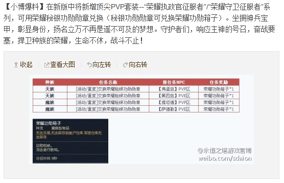 之前官方微博曾爆料,将新增顶尖PVP套装--“荣耀执政官征服者”/“荣耀守卫征服者”系列。最新消息,新的PVP套装可用荣耀秘银功勋勋章兑换:相关报道:官博爆料:将新增顶尖套装--“荣耀执政官征服者”系列官博再更新荣耀执政官征服者之枪曝光P