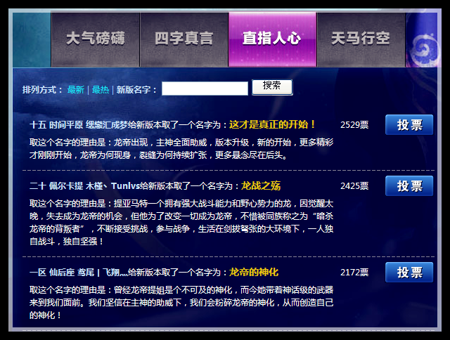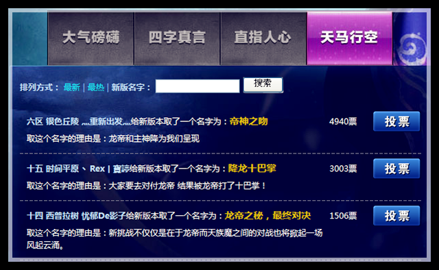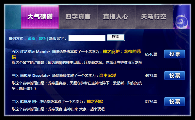 同样也要恭喜以下分别获得4种创意方向投票数最高的前3位玩家(共计12名),你们将分别获得外貌变更券1张,奖励将于8月15日前发放至您的获奖角色,请注意查收。