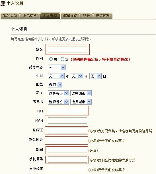 凡报名的各服务器指挥请详细更新开心永恒内的各项个人资料,必须填写 真实的QQ和手机号码,我们将会与报名的指挥取得联系。(红色标注框的内容为必填)