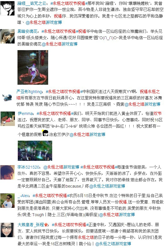 双节接力,祝福绵延。又到了一年一度的金秋佳节之时,“中秋大拜月 长假送祝福”活动正在火热进行中!以下是9月30日的入围玩家名单,他们的祝福将于今晚20时至22时在游戏内公告发布,敬请留意。