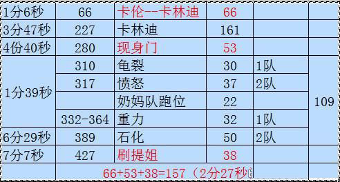 从卡伦对话到提姐前的时间表:我们首先要扣掉的是红色的时间,也就是说从卡伦对话到通关,有2分27秒是我们都无法省下来的。以10分或是11分为极限输出队伍,我们能把握的就是7分33秒或8分33秒。这其中,现身门之间的跑位,跑直线,我想大家的速度都是一样的,这个时间是无法通过输出来提升