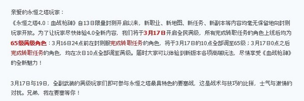 《永恒之塔4.0:血战枪神》自13日限量封测开启以来,新职业、新地图、新任务、新副本等内容均毫无保留地向封测玩家开放。为了让玩家尽快体验4.0全新内容,我们将于3月17日开启全民满级,所有完成转职任务的角色上线后均为65级满级角色:3月16日24点前在封测服完成转职任务的角色,将于3月17日的10点全部调至65级;3月17日0点之后完成转职任务的角色,均在次日10点全部调至满级。届时大家可以体验到新版本各项高端玩法,尽情享受《血战枪神》的全新魅力!