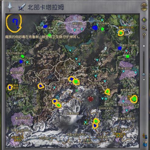 这张图是大复活的图,绿点表示天族大复活,蓝点为魔族大复活。黄圈表示这个位置可以通过传送或者瞬间移动到达。特别的,要塞内还有移动装置,但是现在要塞是龙族的。其中魔左上角的主城和天右上角的主城是可以飞行的区域。