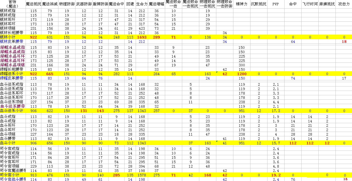 曾经看到朋友给我发过一部分统计的数据,但是没有这么全,不知道是哪位大神统计的,谢谢那位大神,大神看到请留言,我把帖子附上你的传送门。纯手工统计,如有误差请留言。从表格上的数据来看,我偏向于选择绿帽的首饰(戒指、耳环、项链)和绿帽的皮革腰带(或者血斗法系腰带)。因为魔消高,魔抗也够