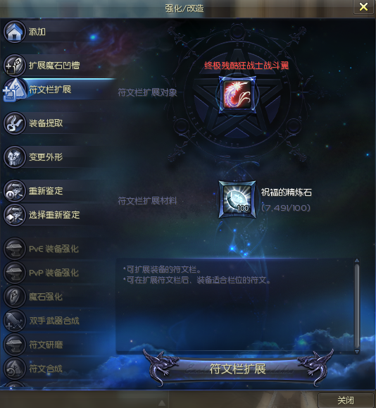 点击背包中的装备道具后,打开强化/改造窗口,即可使用扩展奥迪安/符文凹槽。