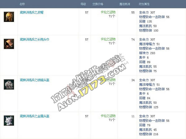 Aion3.0版传承级鸢族训练兵装备属性详解